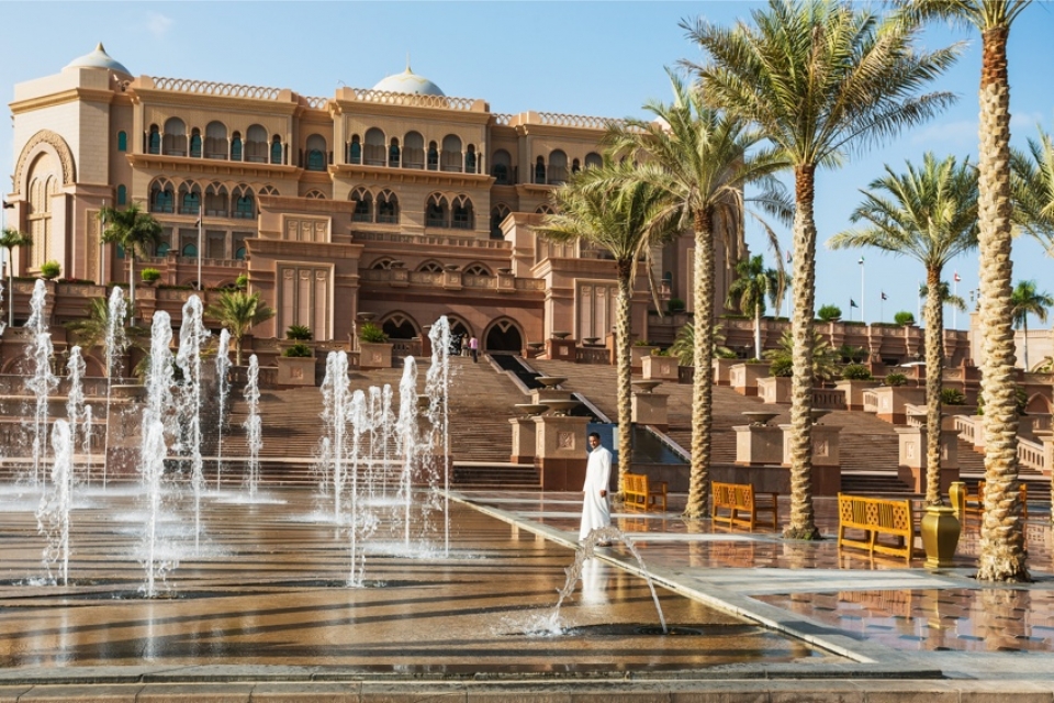 Qasr Al Watan è il palazzo presidenziale e uno dei profili più caratteristici dello skyline di Abu Dhabi. L'edificio diffonde un'atmosfera da Mille e una notte; al suo interno una menzione particolare merita la Grande Sala, una delle stanze più spettacolari, con il suo tripudio di oro, bianco e blu e le decorazioni geometriche suggestive.