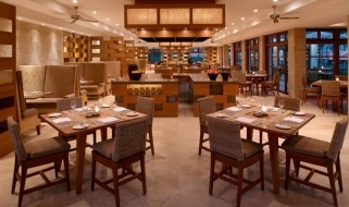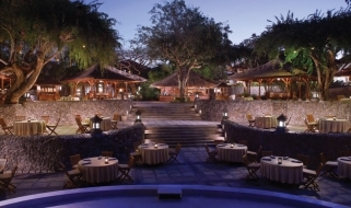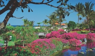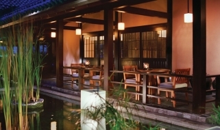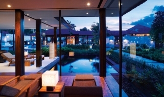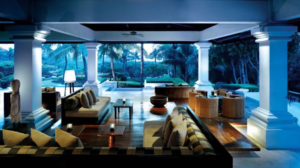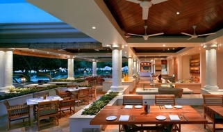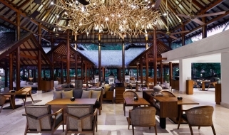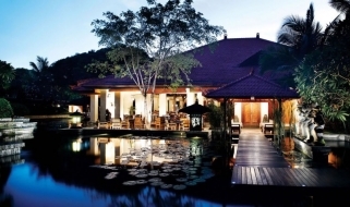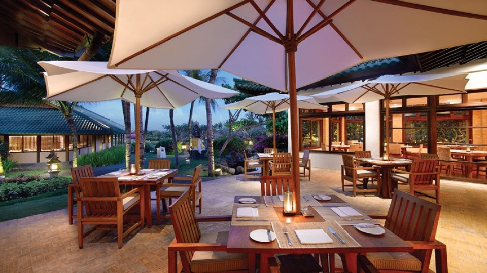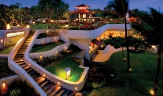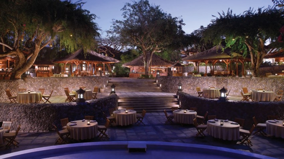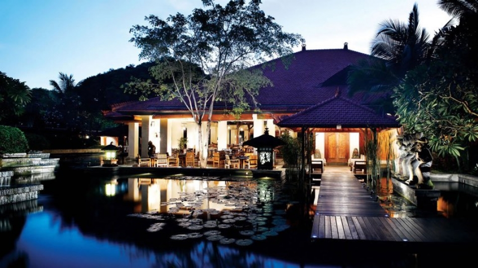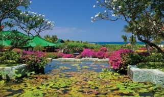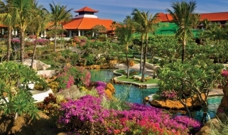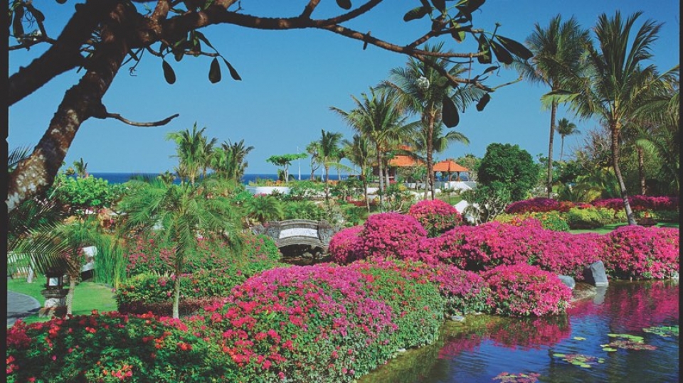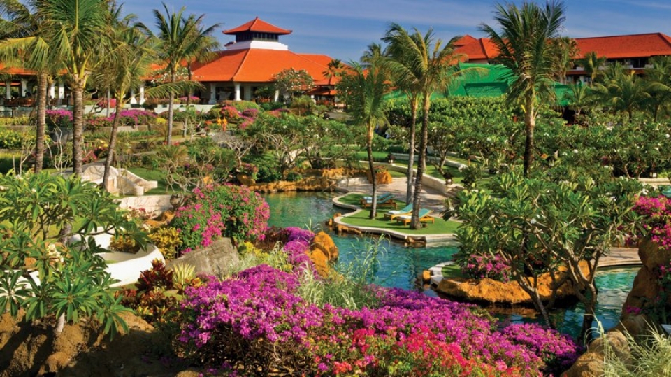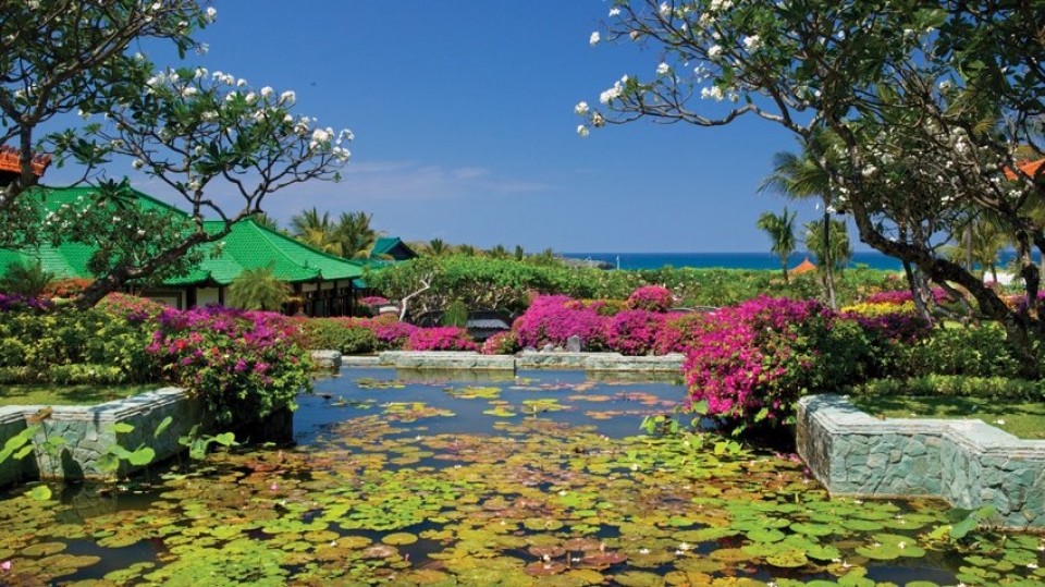 Il resort è stato concepito come un palazzo sull’acqua, con laghi, giardini paesaggistici, piscine, e lagune che si snodano nel complesso composto da edifici bassi in stile balinese e circondato da giardini tropicali.
