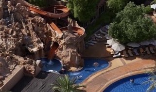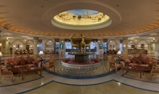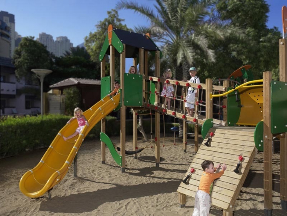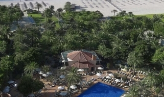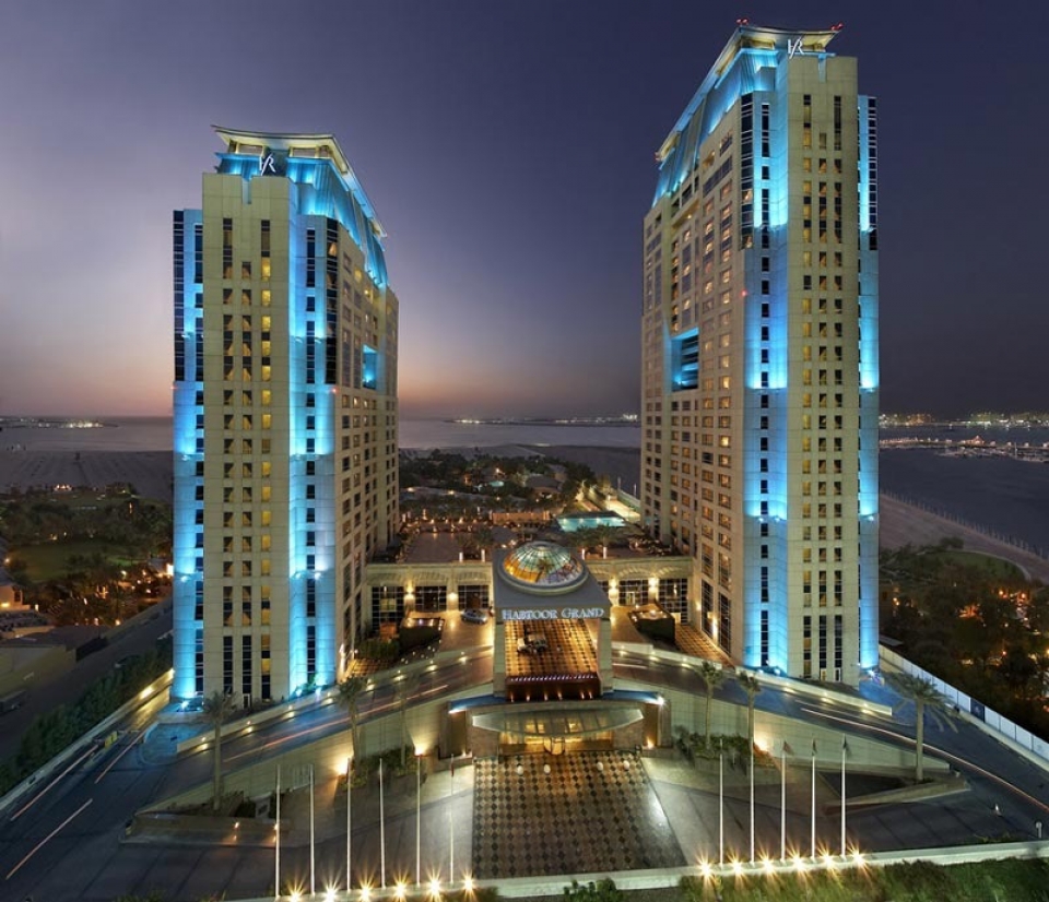 Piscine, ristoranti e bar sono immersi nel giardino tropicale dell'Hatboor Grand Resort & Spa, composto di 446 camere, elegantemente arredate con elementi stilistici arabi, con vista sul giardino o sul golfo di Dubai.