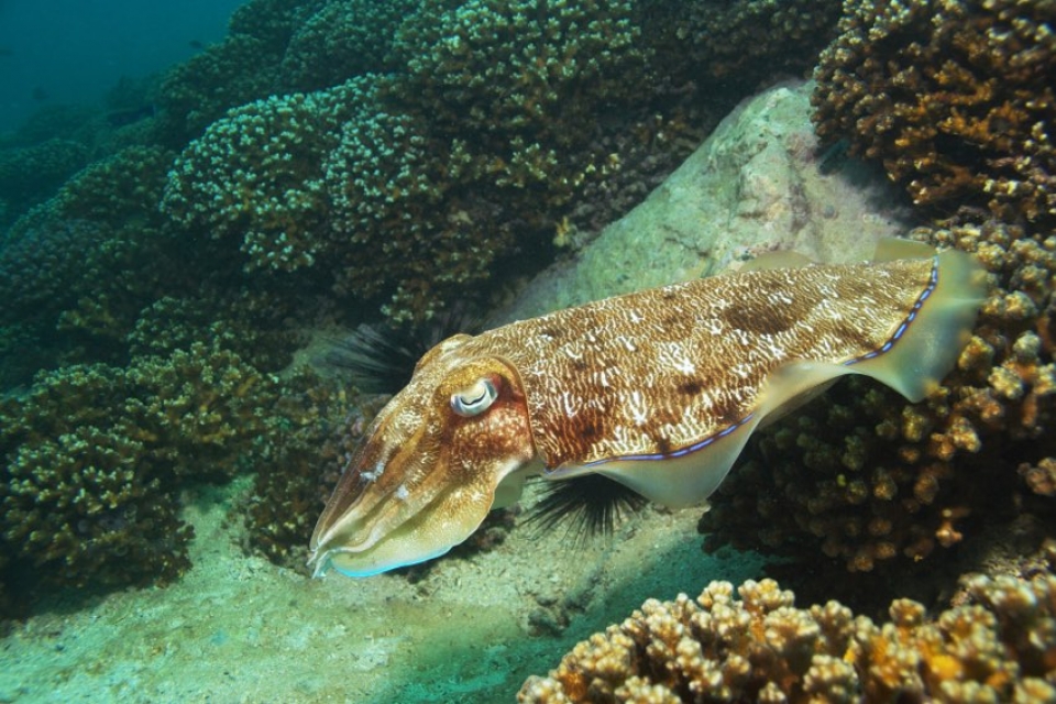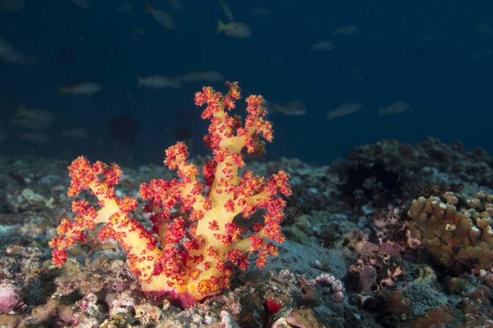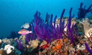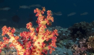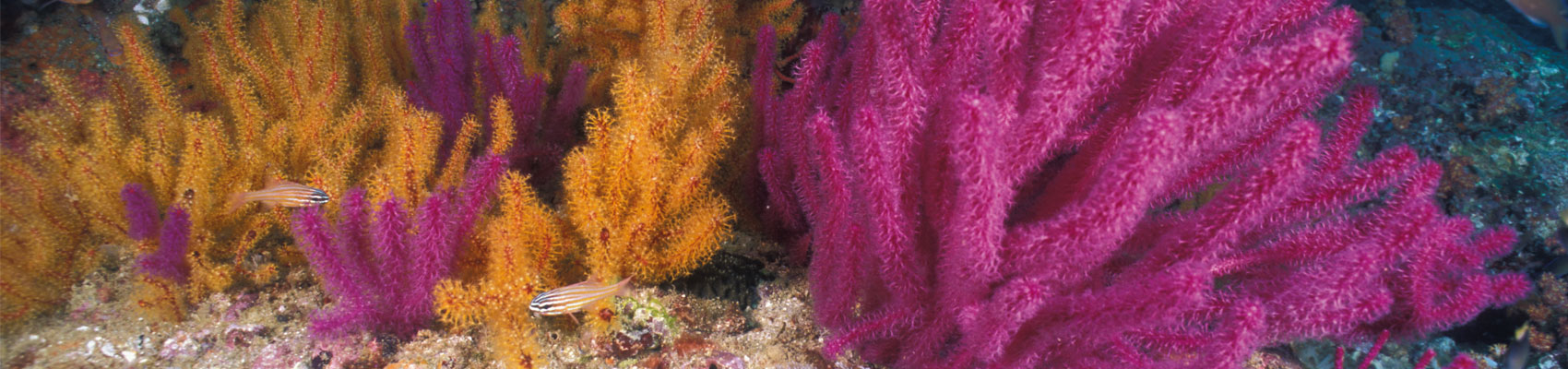 RAS MUSANDAM, fondale ricoperto da cespugli di gorgonie gialle e coralli a frusta dalla colorazione viola-blu, fra cui nuota un fitto campionario di pesci di barriera ed è facile l'incontro con squali pinna bianca;