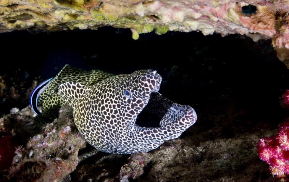 ABU AL HULL con i banchi di barracuda che nuotano in cerchio, grandi aragoste, tartarughe, cernie e murene leopardo;