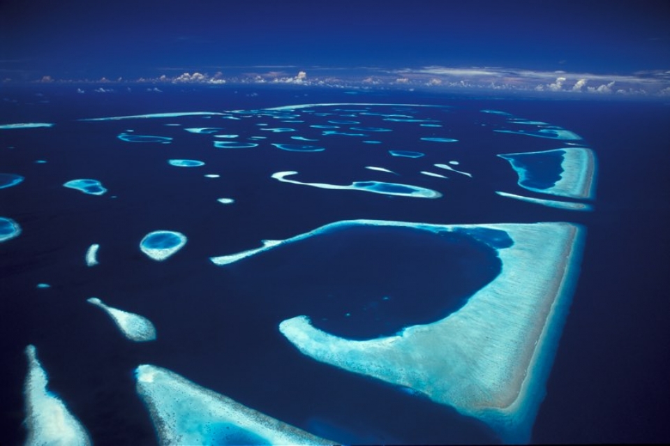 Geografia: L'arcipelago è composto 1.190 isole coralline poggiate su un basamento di roccia formatosi circa 60 milioni di anni fa nel corso dell'emersione d'imponenti montagne dal fondo dell'Oceano Indiano. Sono 26 gli atolli naturali ed ognuno di questi è formato da centinaia di isole. Si estendono per 820 chilometri da nord a sud e per 120 km. da est ad ovest. 202 isole sono abitate, 87 sono isole dedicate esclusivamente ai resort